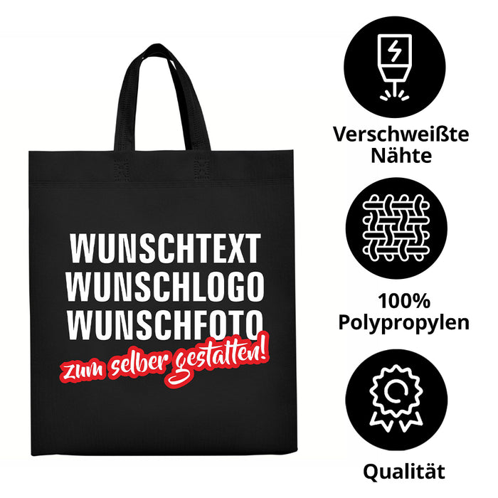 Mit kurzen Tragegriffen von 24 cm Länge sind unsere Taschen bequem zu tragen und bieten eine ideale Balance zwischen Komfort und Funktionalität. Die Grammatur von 100 g/m² gewährleistet eine robuste Konstruktion, die den täglichen Belastungen standhält, während die Verschweißte Nähte für eine zuverlässige Verarbeitung sorgen.