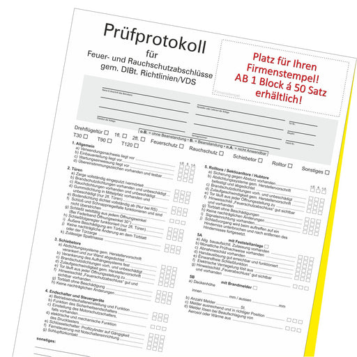 Art. Nr.: PP.DIBT€23,90 - €131,90ab 23,90 €€23,90 - €131,90ab 23,90 €Prüfprotokoll für Feuer- und Rauchschutzabschlüsse nach DIBt-Richtlinien / VdS Mit diesem professionellen Prüfblock dokumentieren Sie Wartung und F...