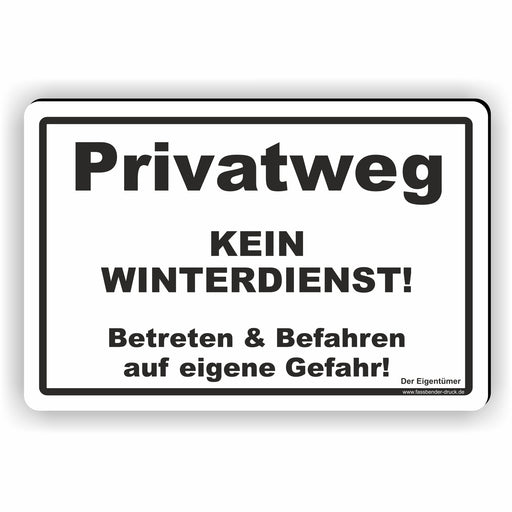 in verschiedenen Größen und MaterialienArt. Nr.: WI-11€7,90 - €80,90ab 7,90 €€7,90 - €80,90ab 7,90 €Hinweisschild „Privatweg – Kein Winterdienst – Betreten & Befahren auf eigene Gefahr“ Produkteigenschaften Trägermaterial: 3 mm Alu-Verbund –...