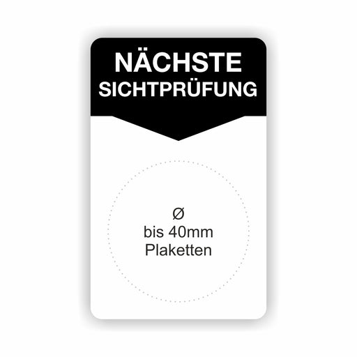 €9,90 - €98,90ab 9,90 €€9,90 - €98,90ab 9,90 €Grundetikett „NÄCHSTE SICHTPRÜFUNG“ 50 × 80 mm – Träger für Prüfplaketten bis Ø 40 mm Ausstattung & Daten Format: 50 × 80 mm mit mittigem Mar...