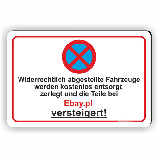 PV-017 Fahrzeug wird versteigert – Parken verboten Schild mit Humorin verschiedenen Größen und MaterialienArt. Nr.: PV-17€7,90 - €80,90ab 7,90 €€7,90 - €80,90ab 7,90 €Spaßiges Verbotsschild „Falschparker werden zerlegt & bei Ebay.pl versteigert“ Produktdetails: Material: Alu-Verbundplatte, 3 mm stark – i... Vollständige Details anzeigen€7,90 - €80,90€7,90 - €80,90€7,90 - €80,90ab 7,90 €