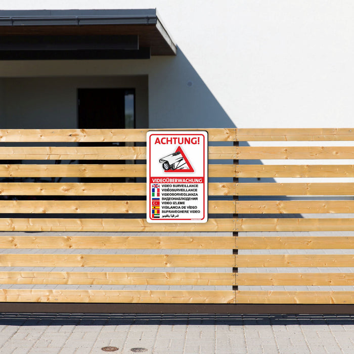 Setzen Sie auf ein langlebiges Warnschild, das in neun Sprachen klar kommuniziert: ACHTUNG – VIDEOÜBERWACHUNG.